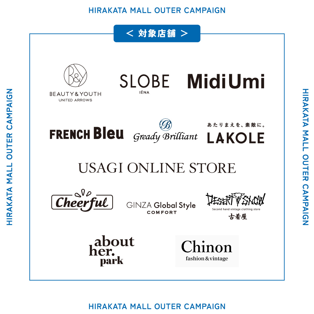 EVENT 2025.10.19 sun HIRAKATA MALL OUTER CAMPAIGN 日程 10.30 thu ~ 11.9 sun 時間10:00~20:00 ※各店無くなり次第終了となります。 ※お一人さま最大10枚まで ※他店舗との合算不可