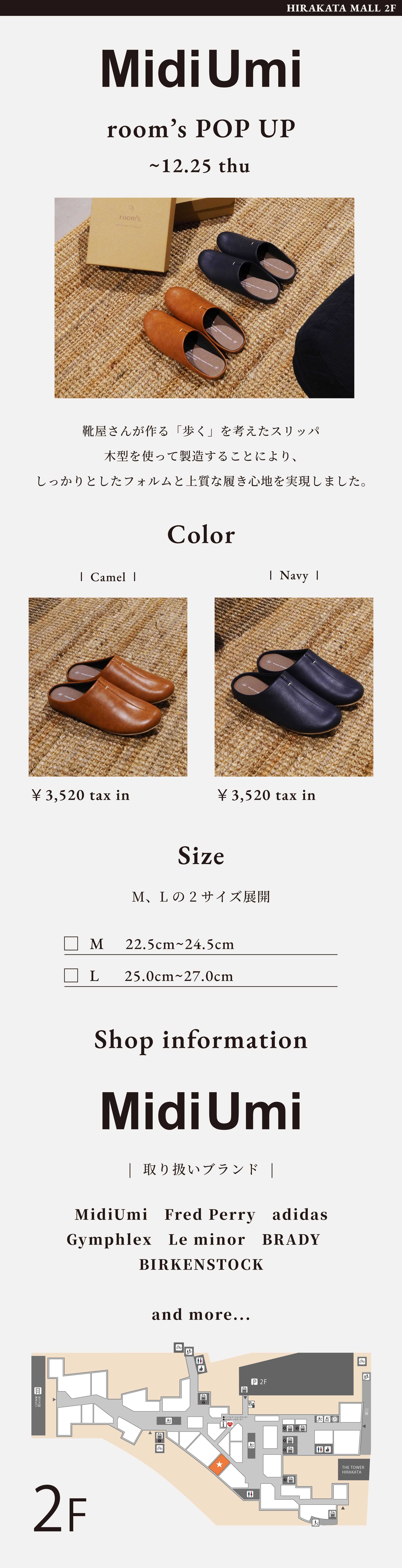EVENT 2025.12.8 mon NEW room's POP UP (MidiUmi) 日程 12.8 mon ~ 12.25 thu 時間10:00~20:00 場所2F MidiUmi MidiUmi room's POP UP ~2025年12月25日(木) room's スリッパ MidiUmi ショップガイド 公式HP