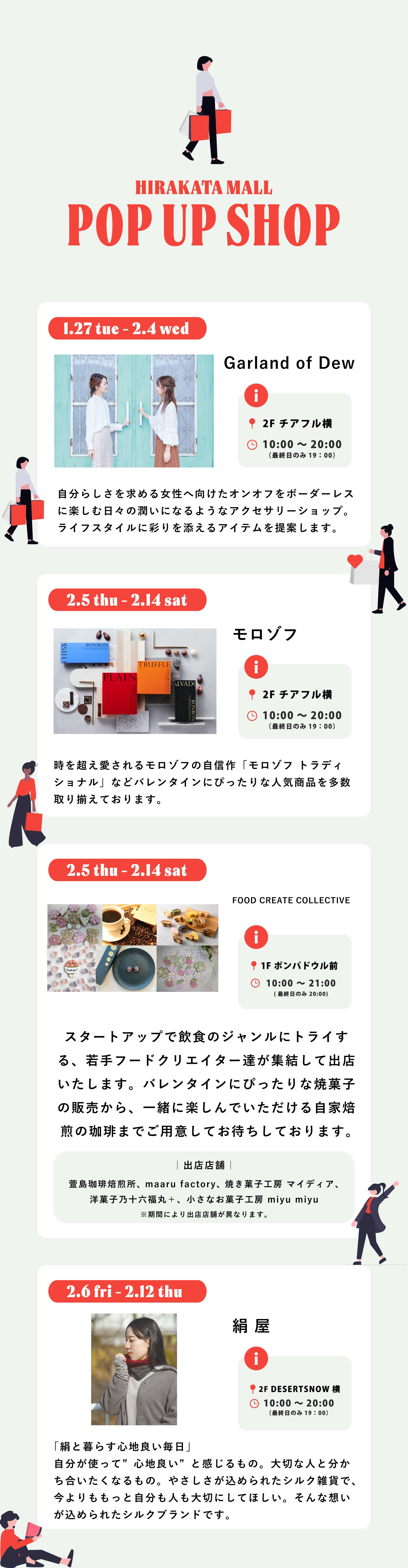 EVENT 2026.2.1 sun NEW 2月前半POP UP情報 日程 2.1 sun ~ 2.14 sat 枚方モールPOP UP SHOP情報! ・Garland of Dew ・モロゾフ ・FOOD CREATE COLLECTIVE ・絹屋