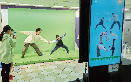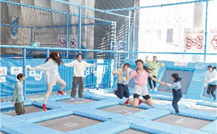 バレーボール選手のジャンプ力に挑戦!トランポリンエリアの壁に設置された選手のジャンプ姿を目指して高く跳ぼう!