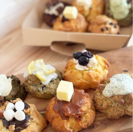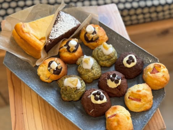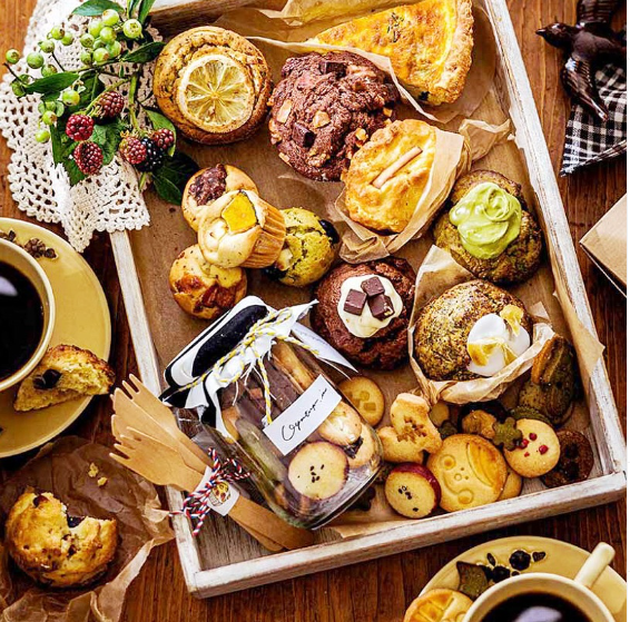 おやつにぴったりなふわもちっ食感のドーナツやバターたっぷりのスコーン、ひとくちサイズのマフィン等ショーケースいっぱいに並べています。